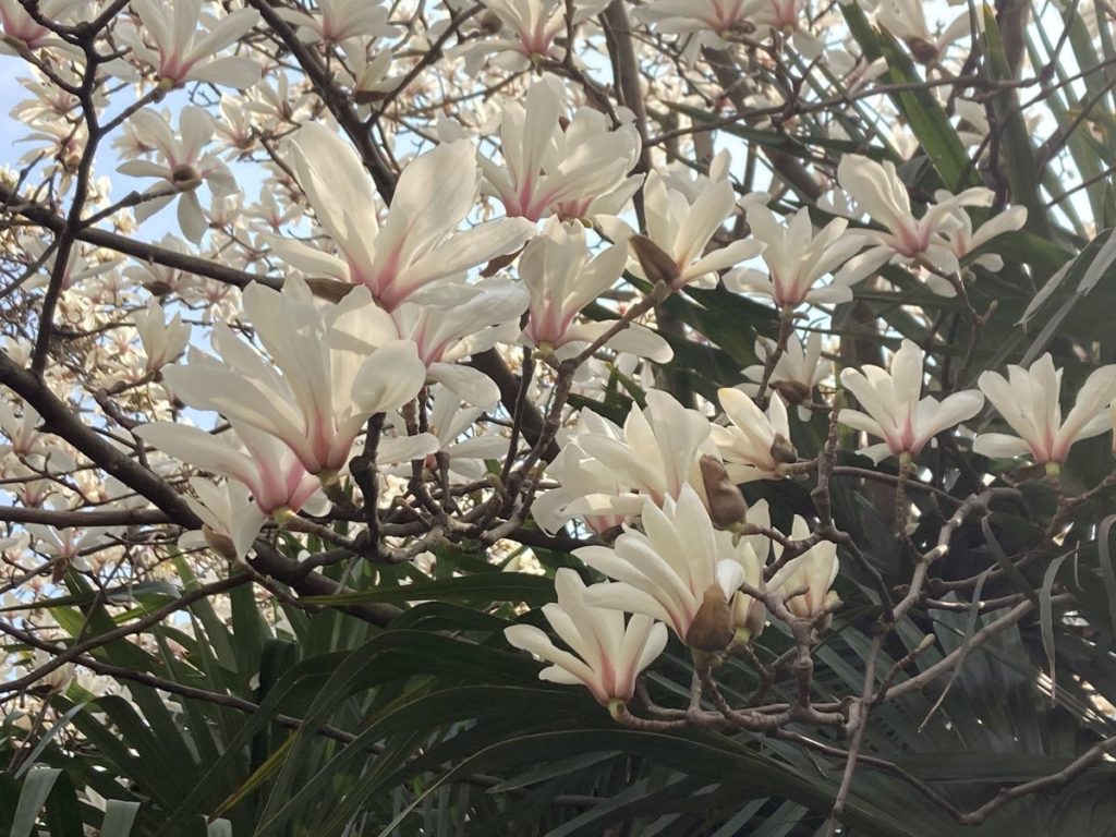 En chine j’ai découvert le magnolia dénudé (M. denudata). Ce magnolia couleur blanc crème originaire est l’emblème de la ville de Shanghai. Il représente la pureté. Sa floraison est une pure merveille. Voyez par vous même :